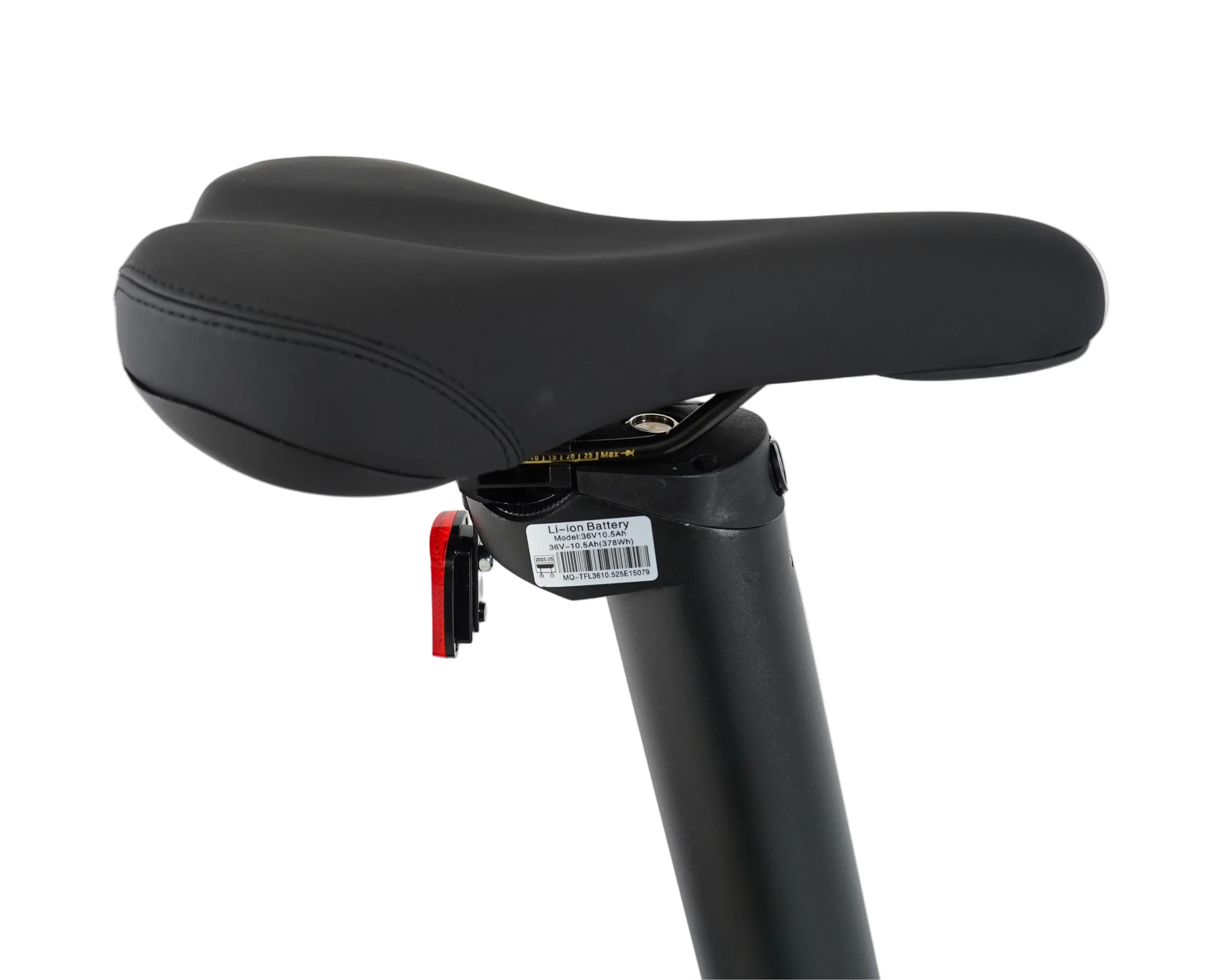 36V 10.5Ah (LG 3500mAh 18650 cells), UL certified, seat-post design |